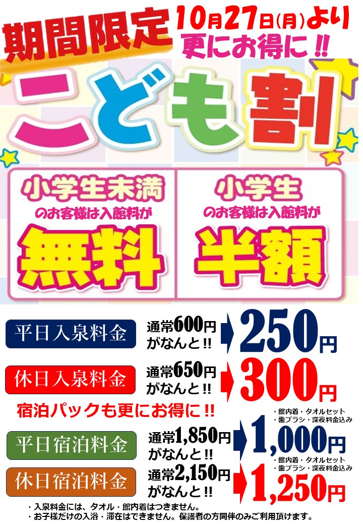 入館料・深夜料金・タオルセット・歯ブラシ・ブランケット込みのプランになります。