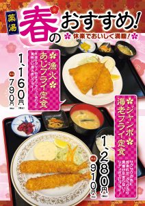 お食事処【休楽】春のおすすめメニュー登場!! 2026.02.24 3階【休楽】で新メニュー登場‼ 春のおすすめメニュー登場 ①ジャンボエビフライ定食 ②漁火アジフライ定食 サウナ×薬湯で体を温まった後は お腹の中も満服に‼ ぜひご来店お待ちしてます。 Tweet この記事のタイトルとURLをコピーする お食事処【休楽】揚げたてデザートメニュー登場!! 前の記事