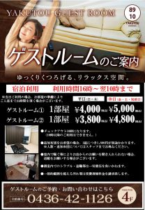 ゲストルーム空室状況 2025.01.20 最新の空室情報はこちらになります。 ※ゲストルームの予約につきましては 電話番号 0436-42-1126 (薬湯市原店) までお願い致します。 ご予約状況により空室状況にズレが生じる場合 がございますのでご理解ください。 Tweet この記事のタイトルとURLをコピーする 大好評宿泊パック‼宿泊&ゲストがお得に‼ 前の記事 薬湯市原店で働いてみませんか? 次の記事